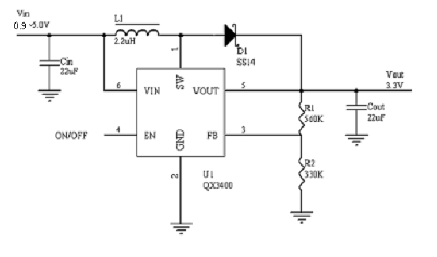 QX3400提供2.5V到5.0V的輸出電壓,采用內部同步開關,無需肖特基二極管就能提供高效的轉換效率。