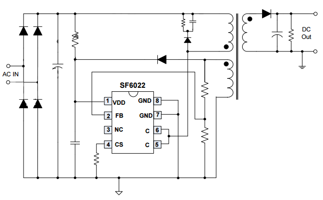 SF6022內(nèi)置的專有NC-Cap簡歷控制/ PSR-IITM控制消除外部補(bǔ)償和濾波電容器。它有內(nèi)置電纜下降補(bǔ)償函數(shù)它可以提供優(yōu)秀的簡歷的性能。IC使用多模式控制來提高效率和可靠性并降低音頻噪聲能量@輕載荷。