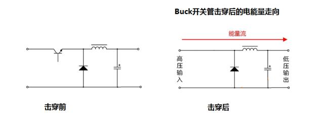 對于Buck電路而言,若開關(guān)管擊穿短路,由于沒隔離,輸入端較高的電壓,直接通過電感作用在負(fù)載端,負(fù)載會(huì)因?yàn)檫^壓燒毀。