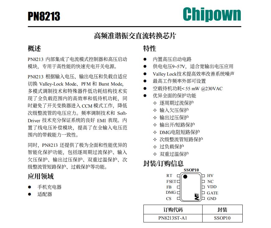 PN8213與海外友商相比,具備“三高一低”壓倒性優(yōu)勢(shì)替代,外圍少2-4顆(OVP復(fù)用)、1/4負(fù)載轉(zhuǎn)換效率優(yōu)于1%以上,啟動(dòng)HV耐壓高出100V,VDD耐壓高出30V,具有市電欠壓保護(hù)、輸出過壓保護(hù)、原副邊防直通保護(hù)、過載保護(hù)、過溫保護(hù)等!