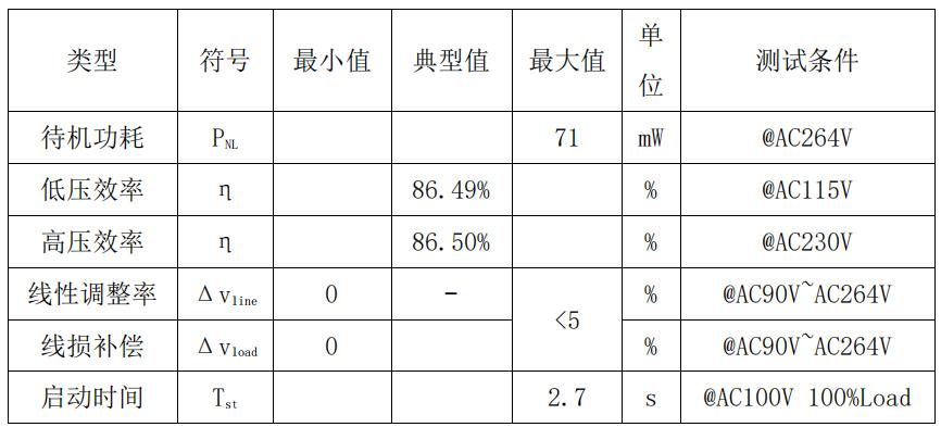2、AC90V滿足啟動(dòng)時(shí)間的條件下,實(shí)現(xiàn)AC264V樣機(jī)待機(jī)功耗僅為71mW;同時(shí)效率能夠滿足最嚴(yán)格的 “COC_V5_T2” 能效標(biāo)準(zhǔn);
