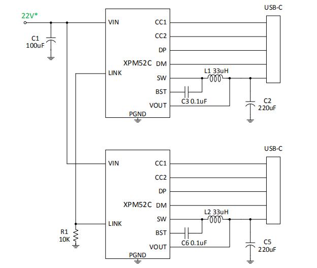 *注意:用兩顆 XPM52C 組成雙 C 口方案時,推薦輸入工作電壓為 22V,可提高轉換效率。