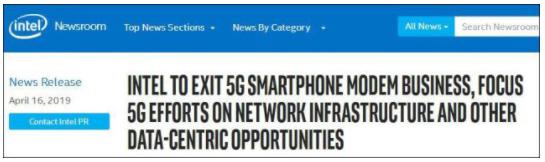 4月17日,5G手機(jī)芯片領(lǐng)域出現(xiàn)戲劇性變化,英特爾放棄蘋果,英特爾公司首席執(zhí)行官司睿博(BobSwan)說:“我們對于5G和網(wǎng)絡(luò)‘云化’的機(jī)遇感到興奮,但對于智能手機(jī)調(diào)制解調(diào)器業(yè)務(wù)而言,顯然已經(jīng)沒有明確的盈利和獲取回報(bào)的路徑。”英特爾宣布退出5G智能手機(jī)調(diào)制解調(diào)器業(yè)務(wù),蘋果和高通達(dá)成“世紀(jì)和解”,重新向高通購買手機(jī)基帶芯片。
