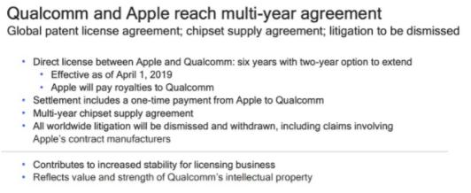但在4月17日凌晨,蘋果和高通公司在各自官網(wǎng)同時(shí)宣布,雙方同意在全球放棄所有訴訟,并簽署至少六年的專利許可協(xié)議,和解協(xié)議中包含的一項(xiàng)重要內(nèi)容是蘋果支付給高通一筆專利款項(xiàng),高通將為蘋果供應(yīng)芯片組,據(jù)悉,蘋果已開始試使用高通的5G通信半導(dǎo)體,并要求多家供應(yīng)商試用,蘋果與高通為期兩年的專利大戰(zhàn)終于告一段落。