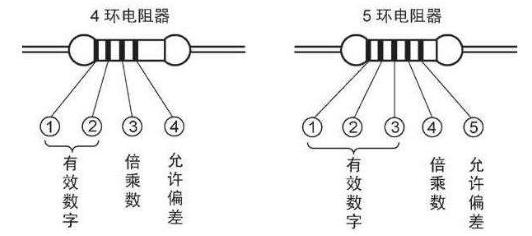 2、色環(huán)標(biāo)注法使用最多,第一道色環(huán)表示阻值的最大一位數(shù)字,第二道色環(huán)表示第二位數(shù)字,第三道色環(huán)表示阻值未應(yīng)該有幾個(gè)零,第四道色環(huán)表示阻值的誤差!