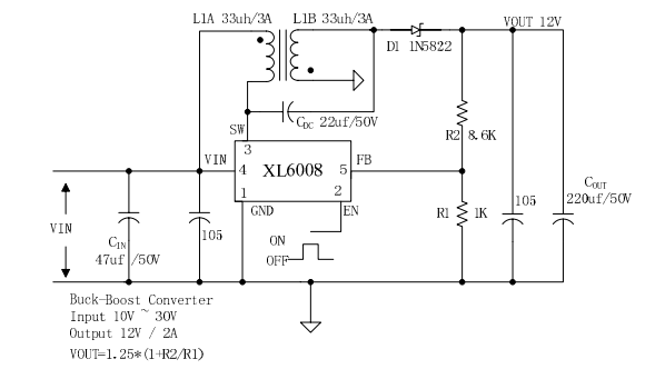 如果要求輸出電流在3A以內(nèi),那么可以用xl6008,這款寬輸入范圍,電流模式,能夠產(chǎn)生或正或負(fù)的輸出電壓的DC / DC轉(zhuǎn)換器,它的輸入電壓范圍是5V~32V,輸出電壓調(diào)節(jié)范圍是60V。12V輸出的實(shí)用電路如圖1.